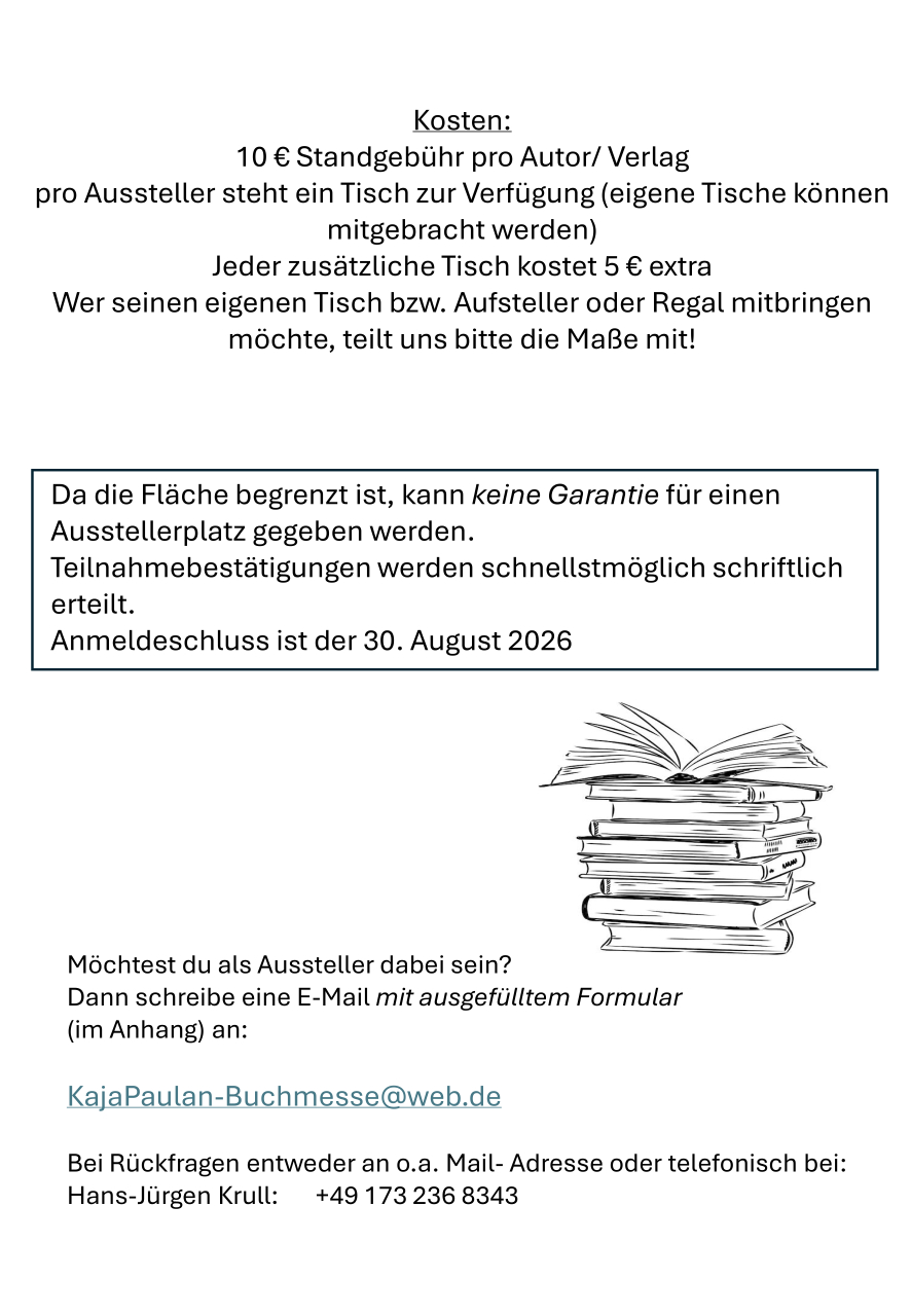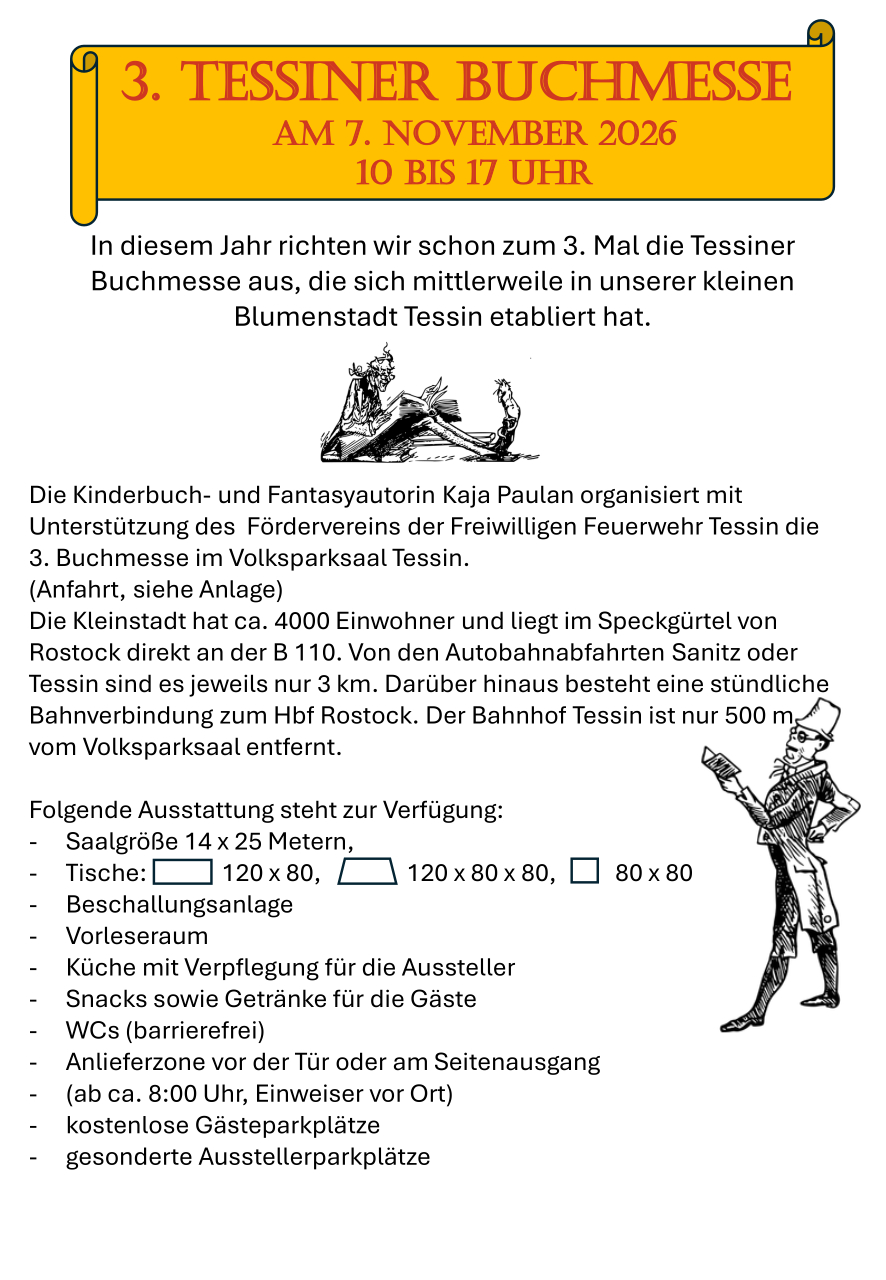 Die Kinderbuch- und Fantasyautorin Kaja Paulan organisiert mit Unterstützung des Fördervereins der Freiwilligen Feuerwehr Tessin die 3. Buchmesse im Volksparksaal Tessin.